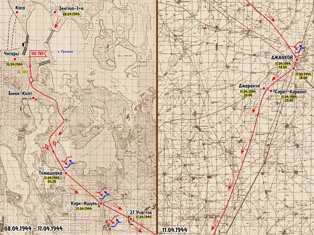 К 18 часам 101 танковая бригада захватила важный железнодорожный мост в 8 км юго-западнее Джанкоя. И к 20 часам вышла на рубеж - Джаракчи, Сират-Каранит, Аз-Джаракчи.