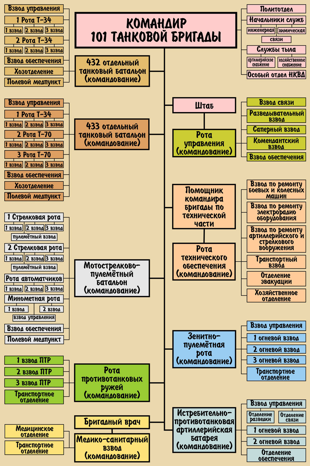 Личный состав 101 танковой бригады с июня 1943 года - 1 138 человек. 1. Старшие и младшие офицеры – 208 человек. 2. Старшины и сержанты – 394 человека. 3. Рядовые – 536 человек.