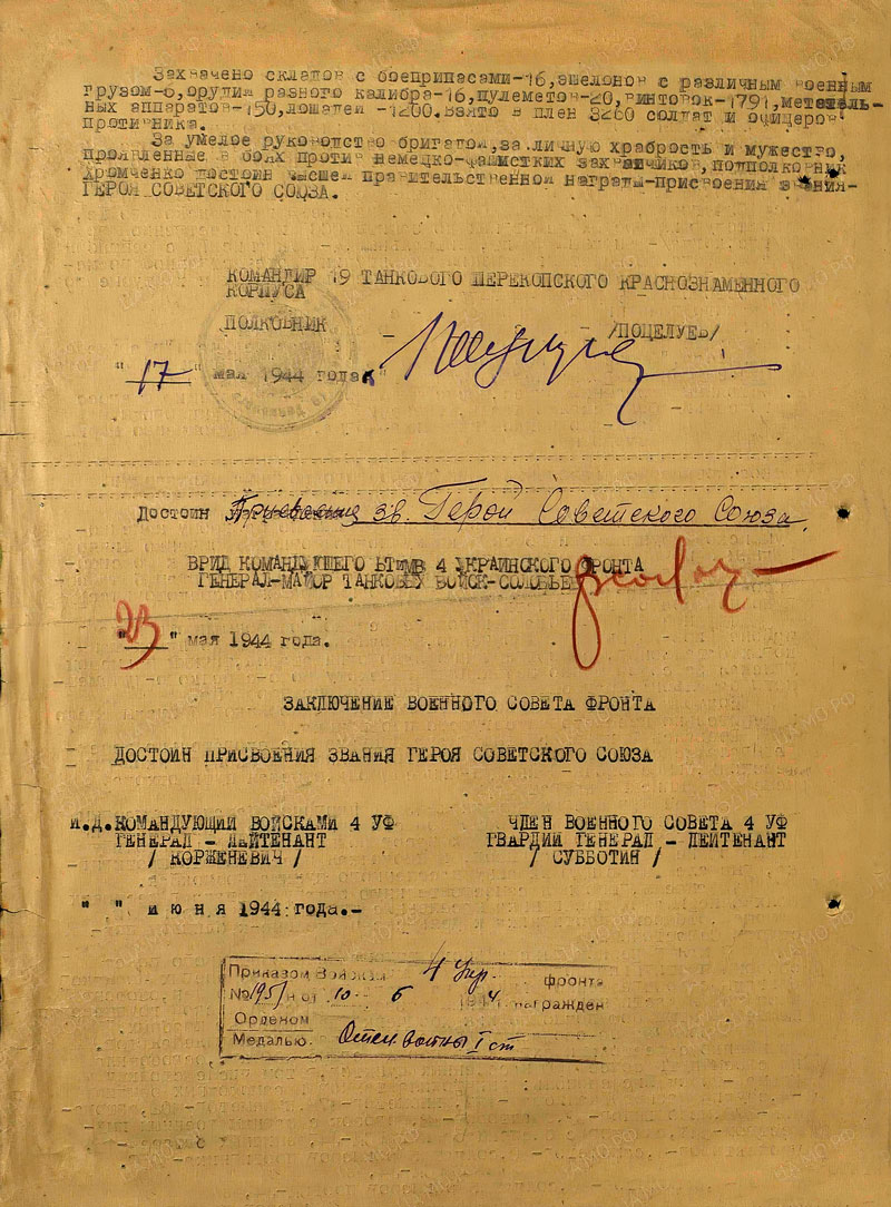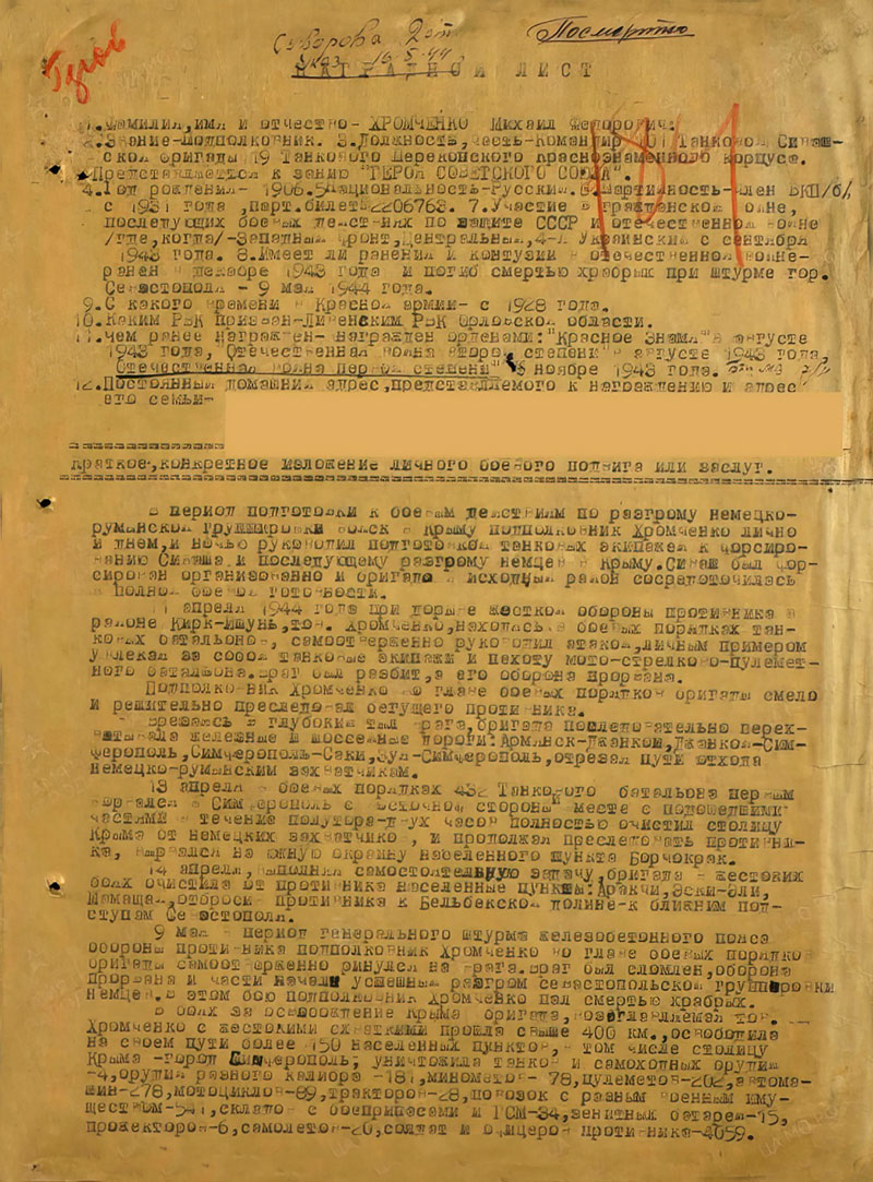 Согласно Наградного листа командира 19 танкового Перекопского Краснознамённого корпуса полковник Поцелуев Иван Абрамович 17 мая 1944 года представил подполковника Хромченко Михаила Фёдоровича к званию Героя Советского Союза. Но исполняющий должность Командующего войсками 4 Украинского фронта генерал-лейтенант Корженевич и Член военного совета 4 Украинского фронта гвардии генерал-лейтенант Субботин отказались пописывать этот наградной лист. Этот наградной лист был реализован в виде награждения орденом Отечественной войны I степени - 10.06.1944. Это в рейтинге орденов СССР 6 по счёту. ЗА ТАКОЙ ПОДВИГ. ЭТО НЕ СПРАВЕДЛИВО!